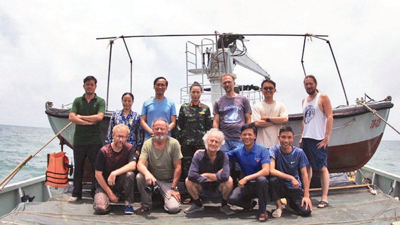 Trung tá, TS Hoàng Thị Thùy Dương (hàng thứ hai, thứ tư, từ trái sang) cùng đoàn công tác của Viện nghiên cứu hải sản và các chuyên gia nước ngoài trong một chuyến công tác tại vùng biển Trường Sa.