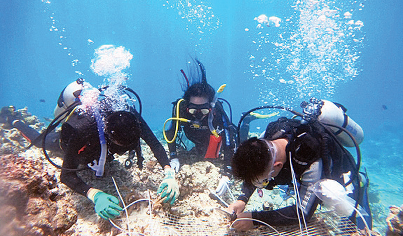 Trung tá, TS Hoàng Thị Thùy Dương (ở giữa) phục hồi san hô ở vùng biển xa bờ.
