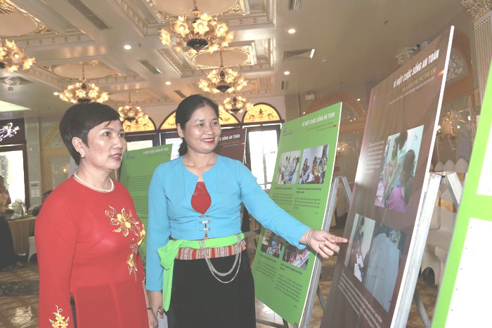 Chị Ngợi (áo xanh) tham quan triển lãm ảnh về các hoạt động trong phong trào thi đua yêu nước của các cấp Hội LHPN tỉnh Hòa Bình
