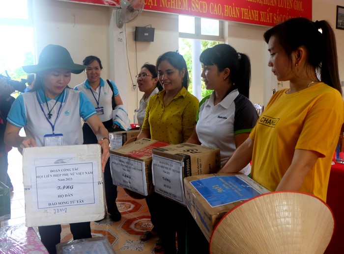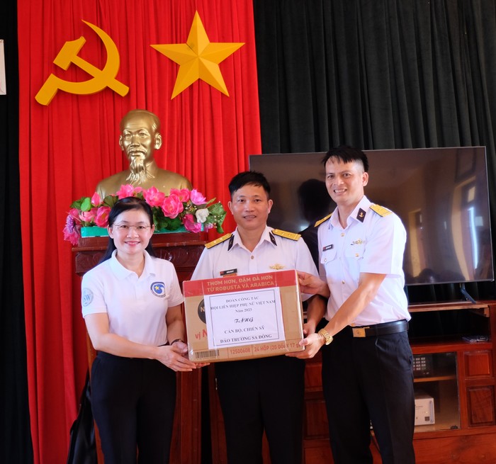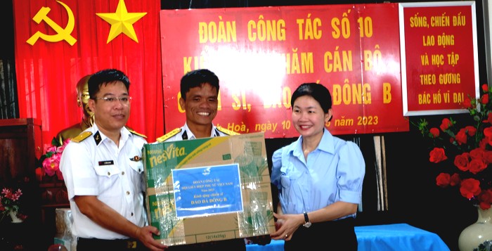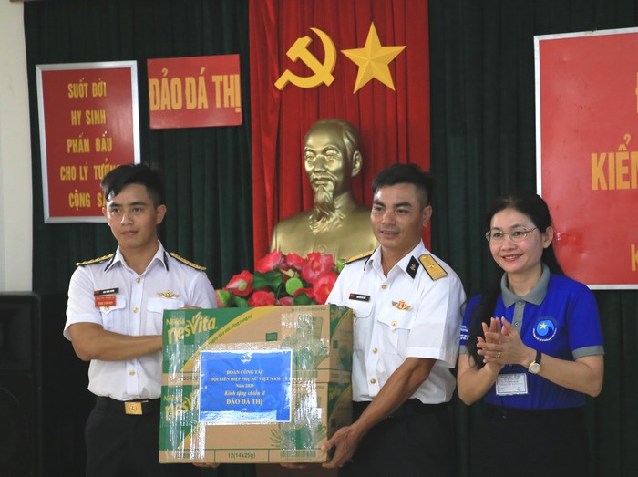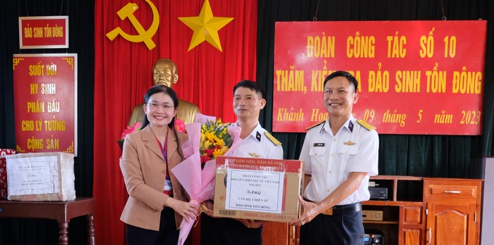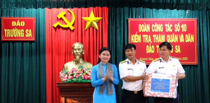 | Trong chuyến thăm huyện đảo lần này, đoàn công tác TW Hội LHPN Việt Nam và các tỉnh thành (An Giang, Bắc Ninh, Bến Tre, Cà Mau, Cần Thơ, Đắk Lắk, Lâm Đồng, Nam Định, Hậu Giang, Quảng Bình, Quảng Trị) đã quyên góp, ủng hộ trên 700 triệu đồng số tiền vận động được đến Quân chủng Hải quân để phân bổ mua các trang thiết bị cần thiết cho các đảo; đóng xuồng CQ và ủng hộ kinh phí “Xanh hóa Trường Sa”. Đoàn cũng trao nhiều phần quà thiết thực, ý nghĩa đến với cán bộ, chiến sĩ, Nhân dân và gia đình hội viên, phụ nữ đang công tác, sinh sống tại các điểm đảo đến. Tổng số tiền mặt và quà trao tặng đợt này đạt trên 1,2 tỷ đồng. Những món quà ý nghĩa, đong đầy yêu thương, thể hiện tấm lòng hậu phương quân đội, tình cảm ấm áp của hàng triệu trái tim phụ nữ trên mọi miền Tổ quốc, sẻ chia với những khó khăn, vất vả; cũng như sự mong đợi và tin tưởng các cán bộ, chiến sĩ, Nhân dân, phụ nữ đã và đang kiên cường vượt mọi gian khó, hoàn thành tốt nhiệm vụ bảo vệ, xây dựng nơi phên giậu biển đảo xa xôi của Tổ quốc ngày càng phát triển, bình yên. Một số hình ảnh trao quà tặng cán bộ, chiến sĩ, chính quyền tại các điểmT đảo: Tặng quà cán bộ, chiến sĩ đảo Đá Đông B Tặng quà cán bộ, chiến sĩ đảo Đá Thị Tặng quà UBND xã Song Tử Tây Tặng quà cán bộ, chiến sĩ đảo Trường Sa Đông Tặng quà cán bộ, chiến sĩ đảo Trường Sa |