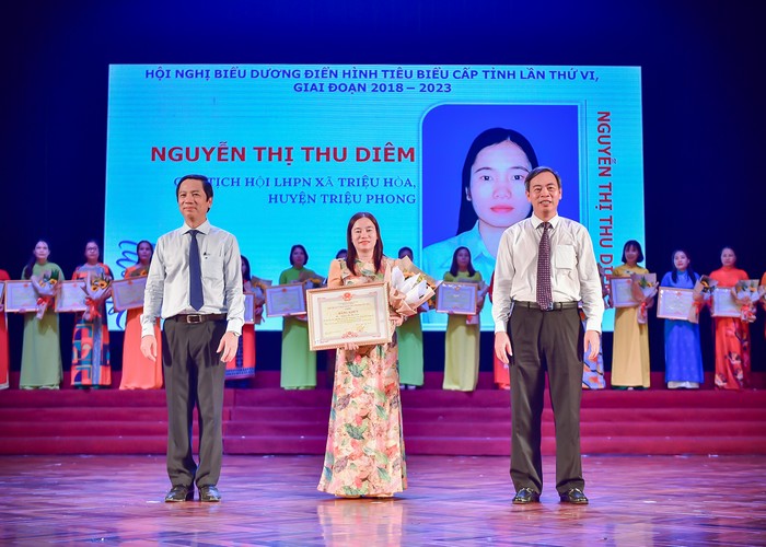 Chị Nguyễn Thị Thu Diêm, Chủ tịch Hội LHPN xã Triệu Hòa, huyện Triệu Phong nhận bằng khen tại Hội nghị biểu dương điển hình phụ nữ cấp tỉnh lần thứ VI, giai đoạn 2018 - 2023