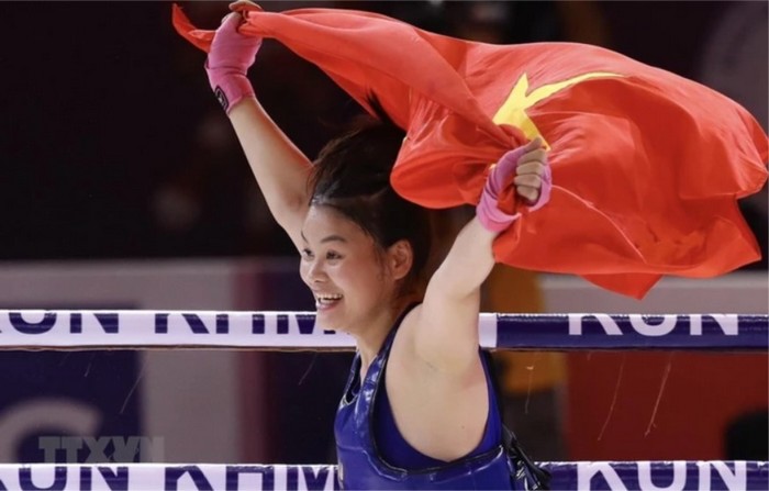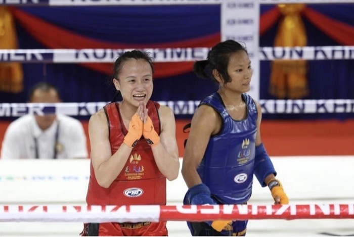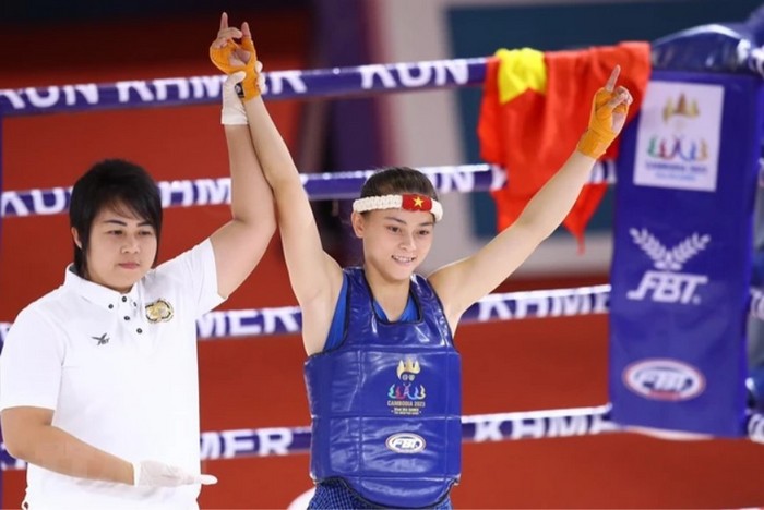 Bàng Thị Mai ăn mừng sau khi đánh bại đối thủ Samnang Sam của chủ nhà Campuchia ở hạng cân 60kg nữ, giành tấm huy chương Vàng thứ 3 cho đội tuyển Kun Khmer Việt Nam. (Ảnh: TTXVN)
