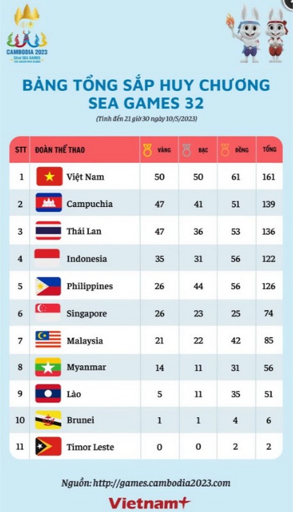 Tính đến hết ngày 10/5, Đoàn Thể thao Việt Nam đã có 50 huy chương Vàng, 50 huy chương Bạc và 61 huy chương Đồng, để vươn lên vị trí số 1 bảng tổng sắp huy chương SEA Games 32.