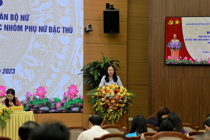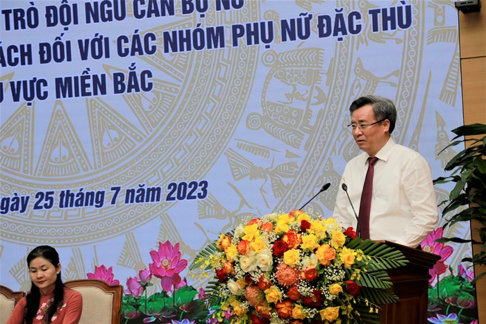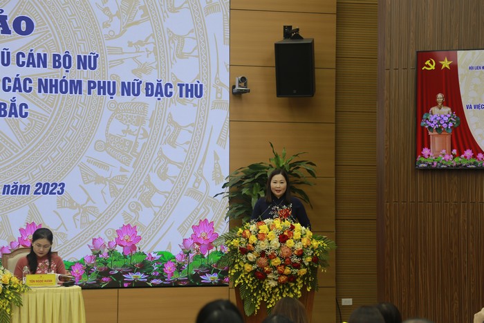 Ủy viên dự khuyết BCH TW Đảng, Phó Chủ tịch Hội LHPN Việt Nam Tôn Ngọc Hạnh báo cáo tổng quan thực trạng đội ngũ cán bộ nữ trong khu vực