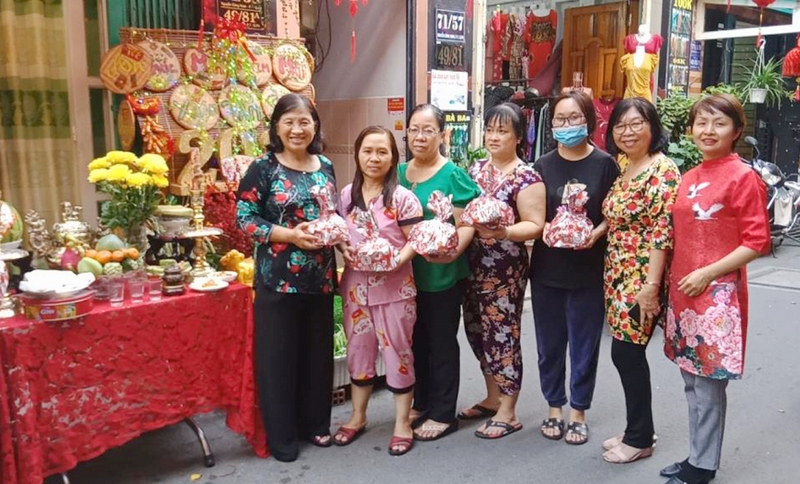 Chị Duyên (thứ hai từ phải qua) tích cực tham gia các hoạt động tại khu phố, nhất là chăm lo cho phụ nữ và trẻ em Cho gia đình yên ấm