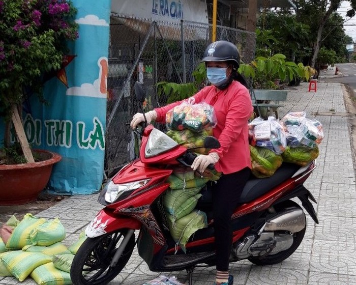 Các chị shipper tình nguyện xã Tam Thôn Hiêp - huyện Cần Giờ chuyển hàng đến hộ dân trong khu cách ly Hàng ngày, cứ 6 giờ sáng, nhóm 10 chị là các hội viên chi, tổ hội phụ nữ xã Tam Thôn Hiệp tập trung tại UBND xã, cùng hỗ trợ với Hội LHPN và UBND xã phân loại nhu yếu phẩm vận động được từ các mạnh thường quân, rồi đóng túi và sắp xếp lên xe máy chở đến tận nơi cho 170 hộ gia đình trong xã. Có những ngày cao điểm, các chị phải đi liên tục mười mấy chuyến để kịp thời chuyển thực phẩm đến tay người dân. Nhờ vậy mà khoảng 500 nhân khẩu mỗi ngày đều được đảm bảo nguồn cung thực phẩm đầy đủ, an toàn. Với tinh thần làm việc luôn hăng hái, không ai nghĩ họ là những hội viên phụ nữ đã ngoài 40, 50 tuổi.