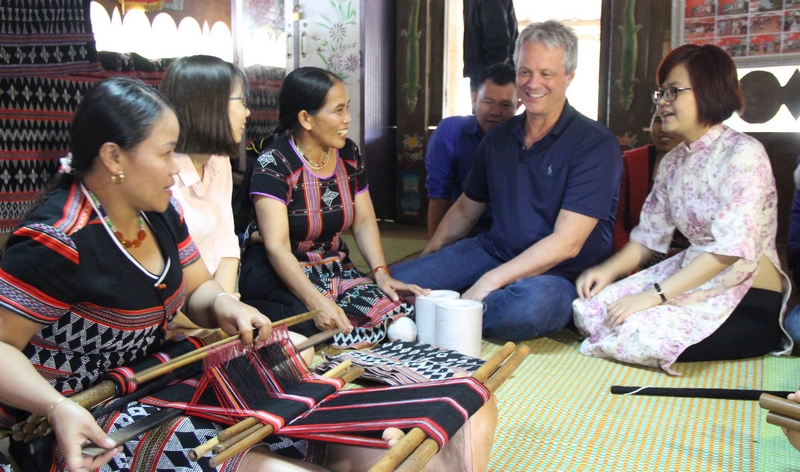 Du khách thích thú với sản phẩm dệt zèng của đồng bào dân tộc A Lưới.