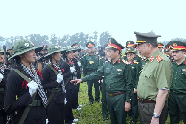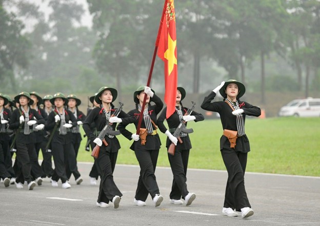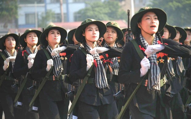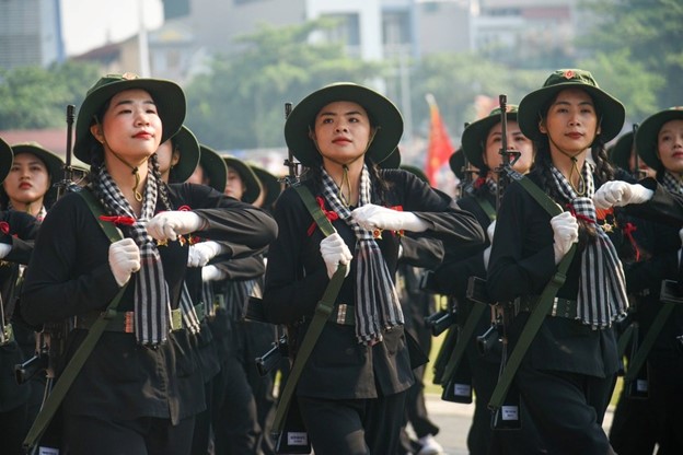 Khối nữ du kích miền Nam trong trang phục áo bà ba, thắt khăn rằn thể hiện khí chất anh hùng của người phụ nữ Việt Nam