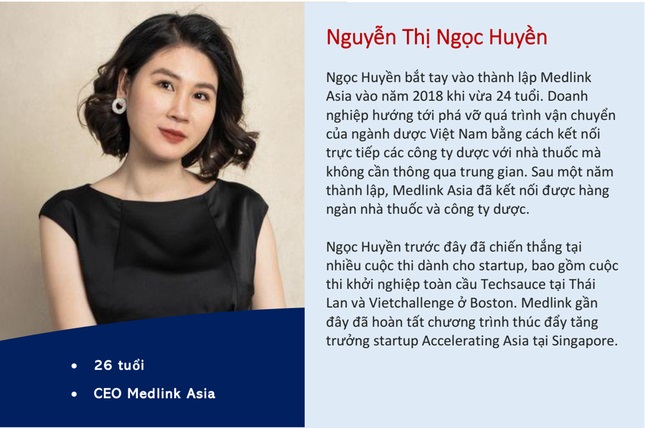 Trong số các gương mặt được vinh danh trong lĩnh vực khởi nghiệp sáng tạo có Nguyễn Thị Ngọc Huyền, CEO Medlink Asia, doanh nghiệp start-up về công nghệ y tế.