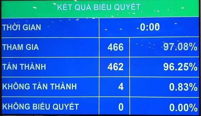 Nghị quyết bầu Thủ tướng Chính phủ được Quốc hội thông qua với 462 trong tổng số 466 ĐBQH có mặt tán thành (chiếm 96,25% tổng số ĐBQH khóa XIV).