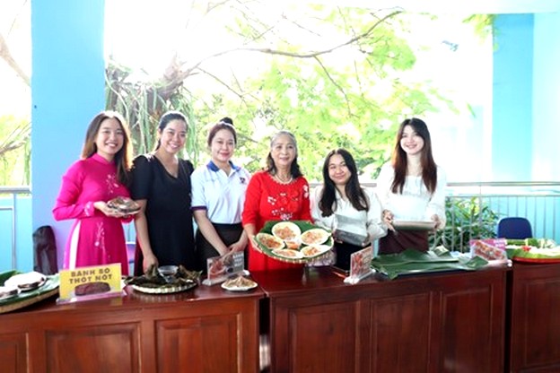 Cô Lê Thị Minh Huệ (thứ 4 từ trái sang, Chi hội phó Chi hội Phụ nữ khu phố 2, phường 14, quận 10, TPHCM) và các con nuôi là sinh viên người Lào tham gia chương trình ẩm thực Việt Nam - Lào - Campuchia nhân dịp Tết Nguyên đán Giáp thìn 2024. Ảnh: Phạm Thương