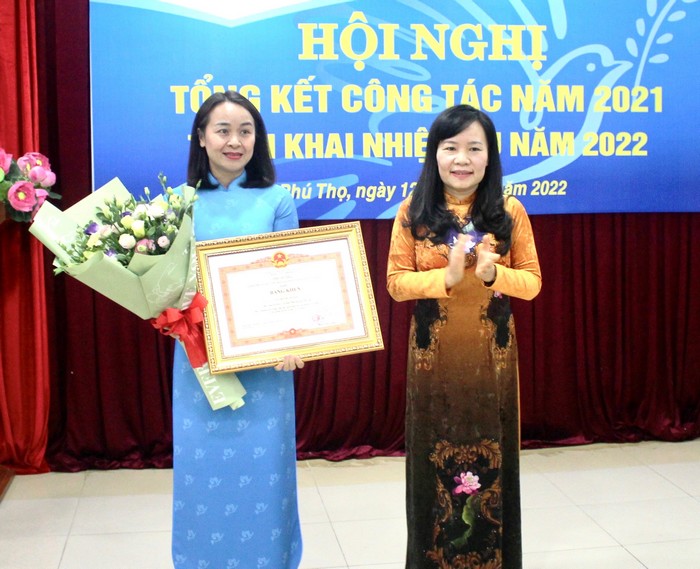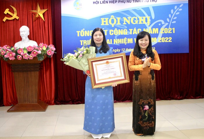 Thừa ủy quyền, đồng chí Nguyễn Thị Thanh Huyền - Ủy viên BTV Tỉnh uy, Trưởng Ban Dân vận Tỉnh ủy trao tặng Bằng khen của Thủ tướng Chính phủ cho tập thể Hội LHPN tỉnh Năm 2021, các cấp Hội LHPN tỉnh Phú Thọ đã thực hiện có hiệu quả các phong trào thi đua và nhiệm vụ trọng tâm trong công tác Hội, 8/8 nhóm chỉ tiêu thi đua đều đạt và vượt kế hoạch đề ra, là đơn vị hoàn thành tổ chức đại hội cấp cơ sở, cấp huyện sớm nhất cả nước. Lập thành tích chào mừng Đại hội đại biểu phụ nữ toàn quốc lần thứ XIII, Hội LHPN tỉnh đã lựa chọn 04 nhóm nội dung và xác định chỉ tiêu thi đua cụ thể cho từng cấp, đã có 240 công trình/phần việc được thực hiện, trong đó Hội LHPN tỉnh gắn biển 03 công trình trị giá gần 2 tỷ đồng, chủ yếu từ nguồn xã hội hóa.