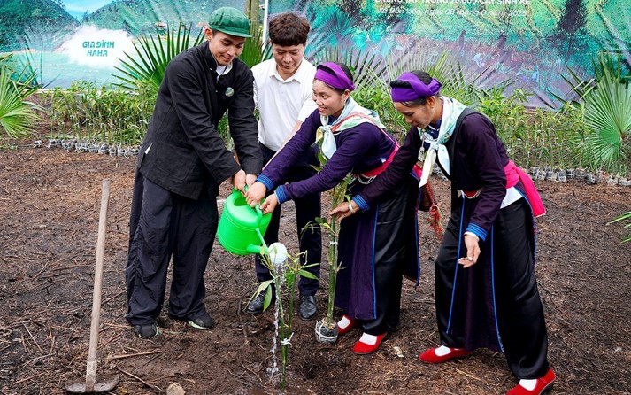 Ca sĩ Jun Phạm, ông Vũ Minh Lý cùng chị em phụ nữ xã Bản Liền trồng cây trong Lễ ra quân Ngày 8/8/2025, tại xã Bản Liền, Lào Cai đã diễn ra Lễ ra quân chương trình trồng cây Gia đình Haha - Vì một Việt Nam hạnh phúc.