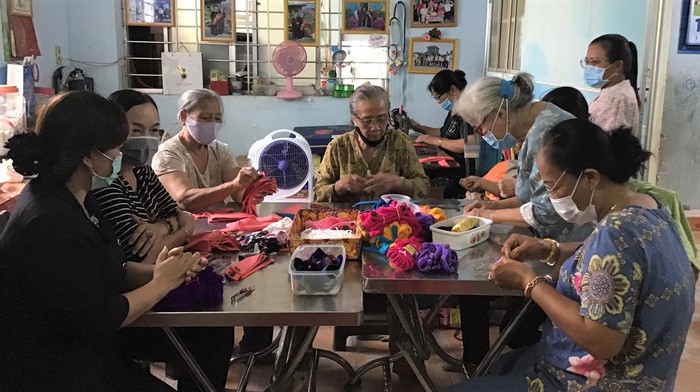 Chủ tịch Hội LHPN tỉnh Nguyễn Thị KimThoa thăm hỏi, động viênTổ Phụ nữ nhân ái thuộc CLB cán bộ nữ hưu trí tỉnh có sáng kiến may tai giả hỗ trợ đeo khẩu trang