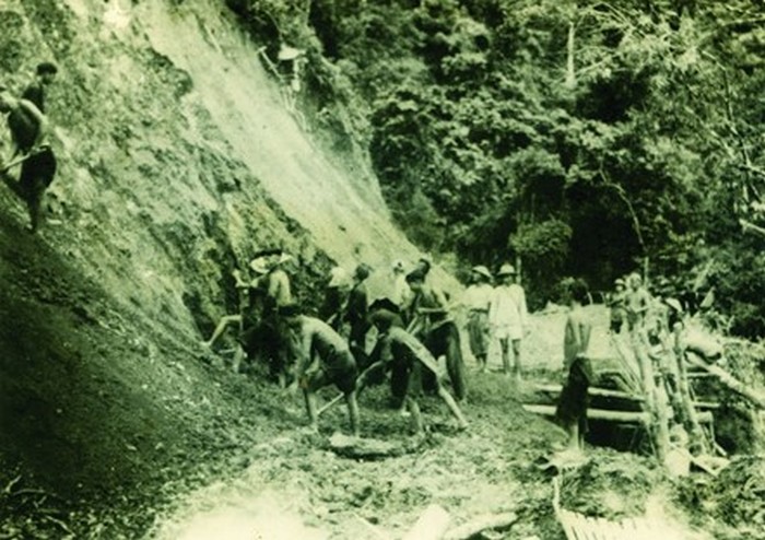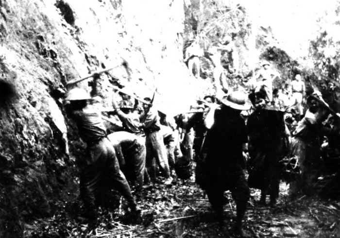 Dân công sửa đường để đưa thương binh về hậu phương trong chiến dịch Điện Biên Phủ