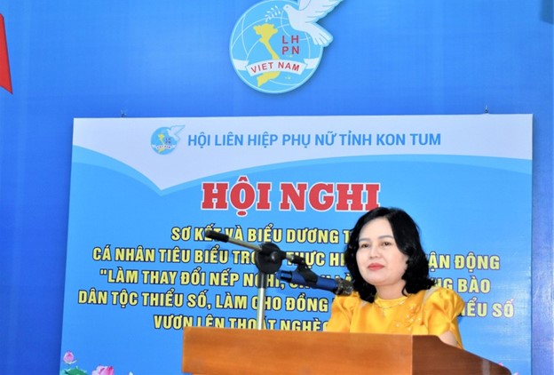 | Hội LHPN tỉnh Kon Tum hiện nay có 102 cơ sở Hội, 761 chi hội (trong đó có 759 chi hội khu dân cư, 2 chi hội đặc thù trong tôn giáo), tổng số hội viên toàn tỉnh 84.382 hội viên/109.541 phụ nữ từ 18 tuổi trở lên (đạt tỷ lệ 77%), trong đó 44.834 hội viên DTTS/61.831 phụ nữ DTTS (chiếm 72,5%). Tính đến tháng 12/2023, trên địa bàn tỉnh có 15.538 hộ nghèo, cận nghèo DTTS (trong đó, 9.716 hộ nghèo, 5.867 hộ cận nghèo). Trong 3 năm qua đã có: 44.796 hội viên phụ nữ DTTS được tuyên truyền, phổ biến nội dung cuộc vận động; 44.796 hội viên phụ nữ DTTS thay đổi nếp nghĩ, bỏ dần những hủ tục lạc hậu, không trông chờ ỷ lại vào sự hỗ trợ giúp đỡ của nhà nước, tự vươn lên thoát nghèo bền vững thông qua công tác tuyên truyền của các cấp Hội phụ nữ; 8.777 hội viên phụ nữ DTTS biết áp dụng khoa học - kỹ thuật vào sản xuất thông qua công tác tuyên truyền của các cấp Hội phụ nữ; 5.703 hội viên phụ nữ DTTS có đời sống vật chất tinh thần được cải thiện thông qua công tác tuyên truyền của các cấp Hội phụ nữ; 1.927 hội viên phụ nữ DTTS tham gia tổ liên kết, Tổ hợp tác, Hợp tác xã, mô hình do Hội LHPN các cấp vận động, hỗ trợ; 1.750 hộ hội viên thoát nghèo.