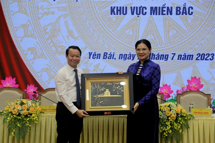 Ủy viên BCH TW Đảng, Chủ tịch Hội LHPN Việt Nam Hà Thị Nga trao tặng quà lưu niệm cho đại diện lãnh đạo tỉnh Yên Bái