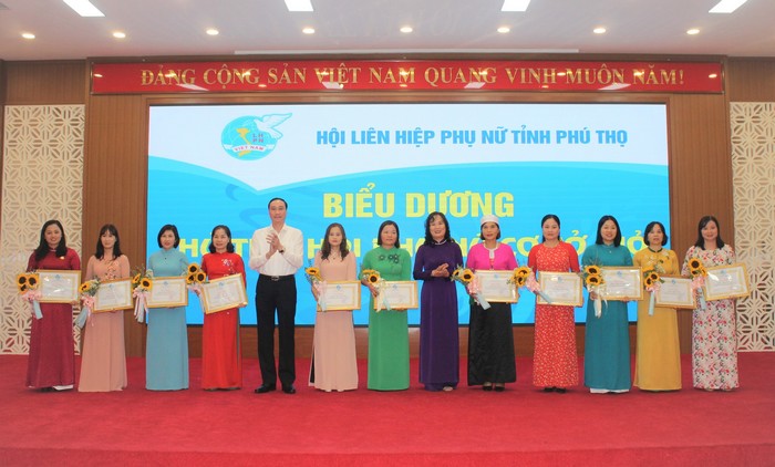 Đ/c Phùng Khánh Tài – Phó Bí thư Thường trực Tỉnh ủy Phú Thọ, và đ/c Trương Thị Thu Thủy – UV Đoàn Chủ tịch – Trưởng Ban GĐXH, TW Hội LHPN Việt Nam tặng hoa và Bằng khen cho Chủ tịch Hội LHPN các xã tại HN Biểu dương Chủ tịch phụ nữ cơ sở giỏi