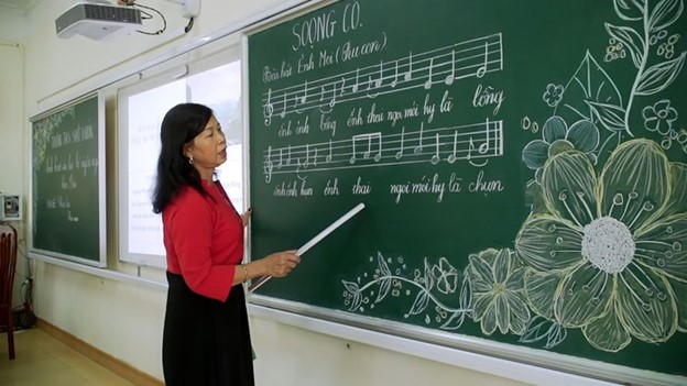 Bà Trương Thị Lê - Trưởng ban Liên lạc cộng đồng Dân tộc Sán Dìu phường Quang Hanh - dạy các em học sinh trường THCS Suối Khoáng hát Soọng Cô trong giờ học ngoại khoá.