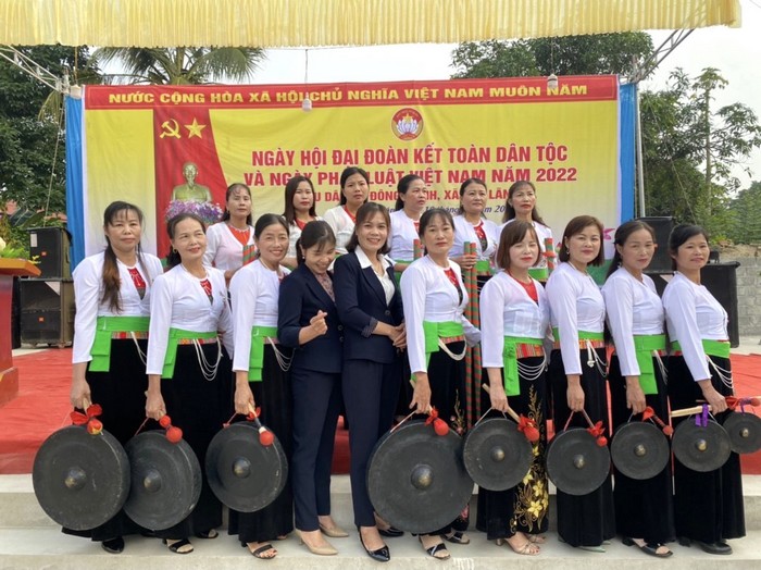 Chị Nguyễn Thị Tuyết chụp ảnh lưu niệm với CLB văn nghệ khu Đông Thịnh nhân ngày ĐĐKTDT và ngày PLVN năm 2022