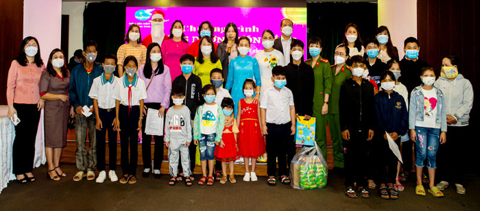 Các lãnh đạo và cha, mẹ đỡ đầu chụp ảnh với các em mồ côi do Covid-19 trong chương trình "Hướng dương đón nắng"