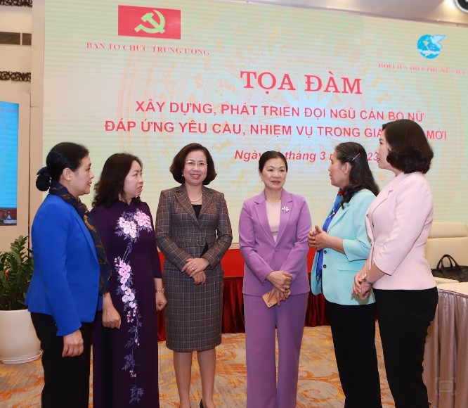 Các đại biểu nữ bên lề buổi Tọa đàm Xây dựng, phát triển đội ngũ cán bộ nữ đáp ứng yêu cầu, nhiệm vụ trong giai đoạn mới”