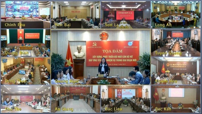 Uỷ viên Bộ chính trị, Thường trực Ban Bí thư, Trưởng ban Tổ chức TW Trương Thị Mai (thứ 6 từ trái sang) và các đại biểu chụp ảnh lưu niệm tại toạ đàm Tọa đàm “Công tác xây dựng, phát triển đội ngũ cán bộ nữ đáp ứng yêu cầu tình hình mới” được tổ chức theo hình thức trực tiếp tại Hà Nội và trực tuyến tại điểm cầu 62 tỉnh/thành phố.