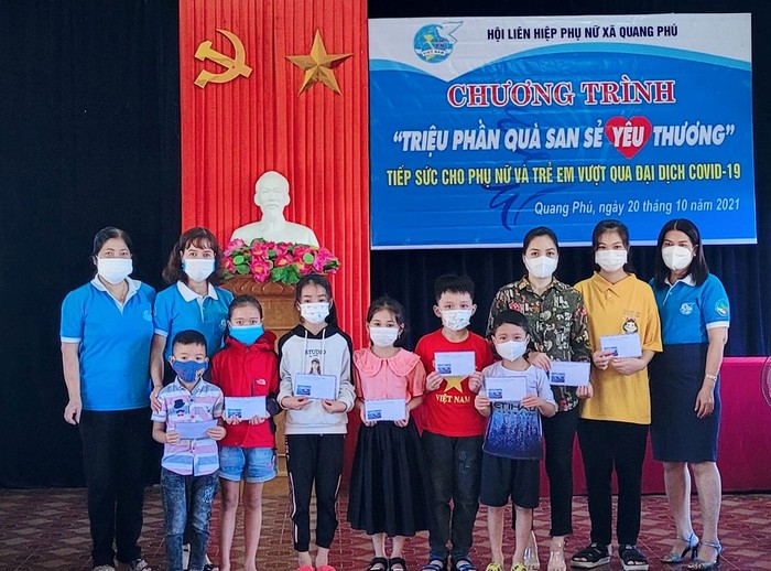 Tổ chức chương trình “Triệu phần quà san sẽ yêu thương” tại xã Quang Phú Hưởng ứng chương trình “Triệu phần quà san sẻ yêu thương” do TW Hội LHPN Việt Nam phát động, các cấp Hội trên địa bàn thành phố đã tổ chức thăm hỏi và trao tặng 457 suất quà gồm tiền mặt, vật dụng và nhu yếu phẩm,… với tổng trị giá 104.590.000 đồng nhằm động viên, chia sẻ tới các gia đình phụ nữ nghèo, cận nghèo; trẻ em có hoàn cảnh khó khăn; phụ nữ cao tuổi đơn thân, gia đình nữ bệnh nhân bị nhiễm Covid-19, phụ nữ và trẻ em bị nhiễm HIV, cán bộ Hội đương nhiệm và qua các thời kỳ có hoàn cảnh khó khăn. Đồng thời, các đơn vị Hội cơ sở tiếp tục tham gia hỗ trợ nấu ăn tại bếp ăn BCH Quân sự thành phố phục vụ các khu cách ly tập trung trên địa bàn.