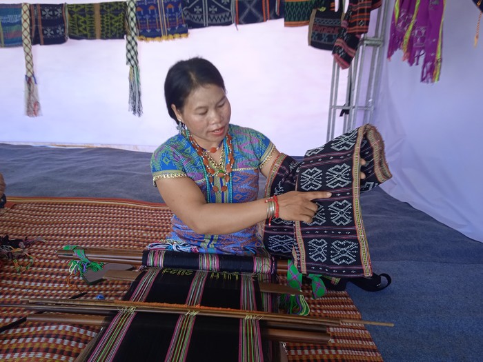 Chị Pơ Loong AGoóc đang giới thiệu với tác giả về qui trình dàn cườm tạo hoa văn trên nền vải thổ cẩm Cơ Tu