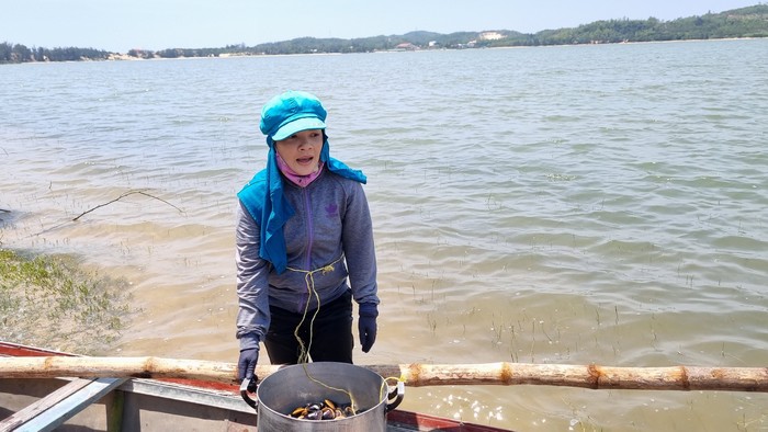 “Đặc sản ở đầm chính là con dọp sống vùi mình trong cát. Muốn bắt được nó thì phải lặn xuống, lấy nĩa xới cát lên rồi bắt từng con một, bỏ vào túi lưới đeo trước cổ, chừng vài phút lại ngoi lên bỏ vào trong rổ, cứ tiếp tục mãi như thế”, chị Hoa ở phường Phổ Thạnh vừa dầm mình dưới nước vừa giải thích. Thường buổi bắt dọp kéo dài ít nhất 2 - 3 tiếng. Lặn ngụp khá lâu trong nước, sắc da của chị Hoa và những người mưu sinh trên đầm trở nên trắng nhợt và có phần thấm mệt. Thành quả buổi “đi săn” hôm nay, chị Hoa thu về tầm 7 - 8kg dọp, kiếm được vài trăm nghìn.