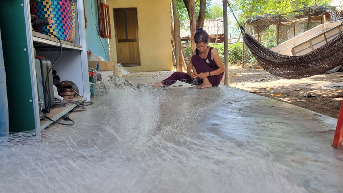 Bà Thúy ngồi đan lưới để đánh bắt cá