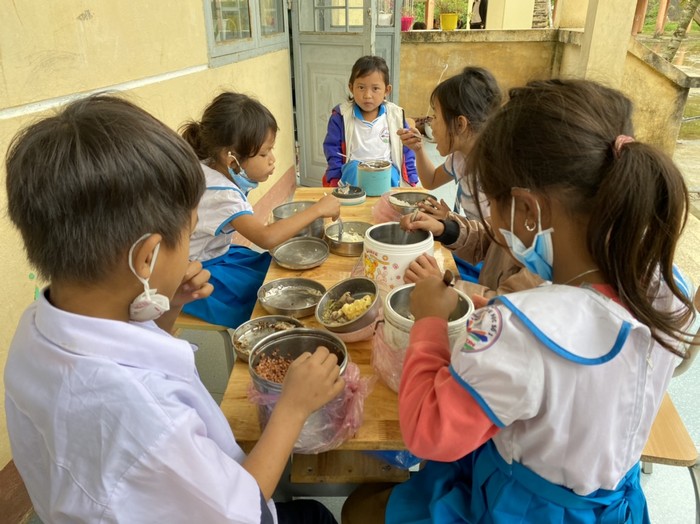 Bữa cơm trưa của các em học sinh ở điểm trường thôn Tây