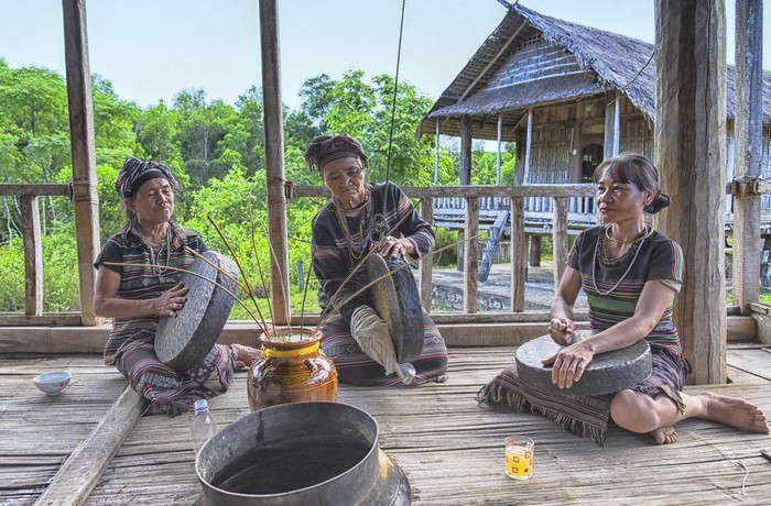 Phụ nữ Hrê chơi chiêng ba ở nhà sàn văn hóa làng Teng, xã Ba Thành, huyện Ba Tơ Bước vào tuổi 82, tuổi cao, sức yếu, bà Phạm Thị Sỹ ở xã Ba Vinh, huyện Ba Tơ đã nghỉ hẳn chuyện nương rẫy. Phần lớn thời gian bà Sỹ chỉ ở nhà, quẩn quanh trên căn nhà sàn nhỏ. Thấy khách đến nhà, bà sẽ thể hiện trình diễn cồng chiêng cho mọi người nghe. Những nắm tay hằn đầy vết thời gian khi vung lên, hạ xuống đầy dứt khoát.