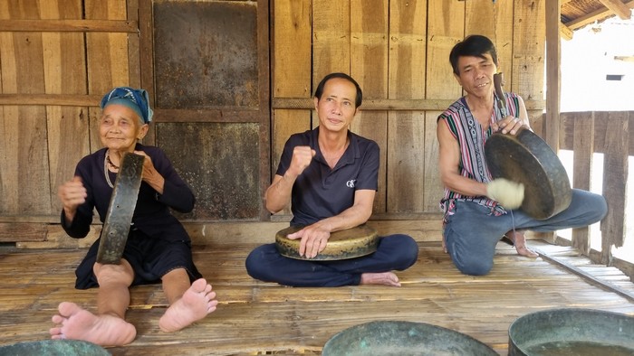 Bà Phạm Thị Sỹ dù tuổi cao nhưng vẫn đánh chiêng ba một cách dứt khoát và làm người nghe say mê