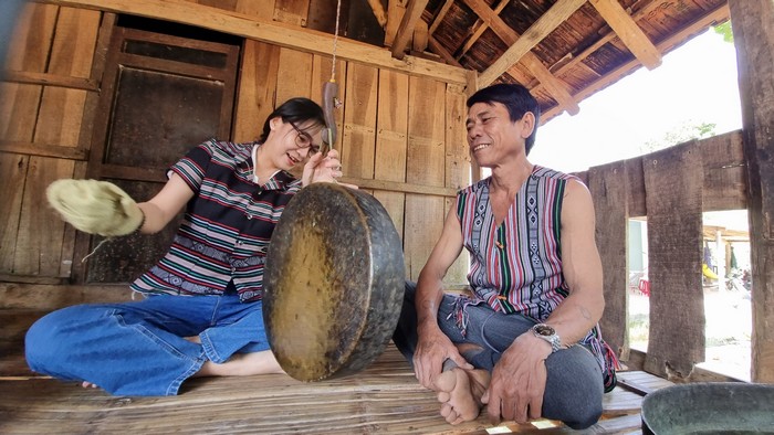 Du khách đến tham quan, trải nghiệm đánh chiêng ba của đồng bào Hrê
