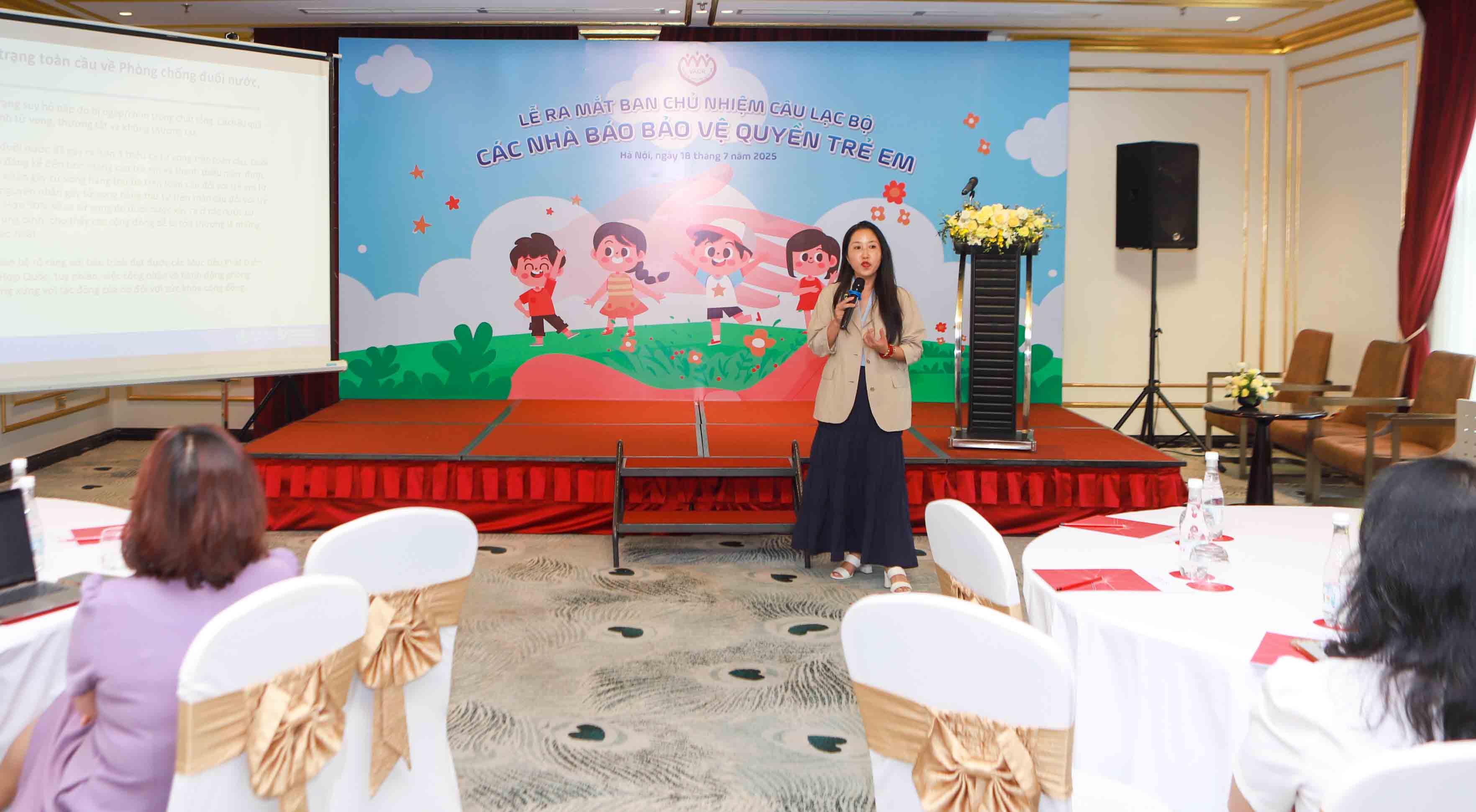 Chủ tịch Hội Bảo vệ quyền trẻ em Việt Nam Nguyễn Thị Thanh Hòa (thứ 3 từ phải sang) tặng hoa chúc mừng Ban Chủ nhiệm Câu lạc bộ Phát biểu tại sự kiện ra mắt Ban Chủ nhiệm Câu lạc bộ "Các nhà báo bảo vệ quyền trẻ em", bà Nguyễn Thị Thanh Hòa, Chủ tịch Hội Bảo vệ quyền trẻ em Việt Nam, nhấn mạnh vai trò của các cơ quan báo chí trong thông tin, tuyên truyền, phổ biến đường lối, chủ trương, chính sách, pháp luật của Đảng và Nhà nước về thực hiện và bảo vệ quyền trẻ em; phản ánh tình hình trẻ em, hướng dẫn dư luận xã hội, phát hiện gương điển hình; Đấu tranh phòng chống các hành vi vi phạm về quyền trẻ em...