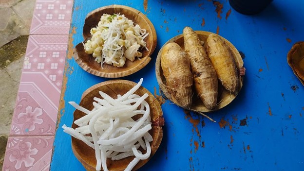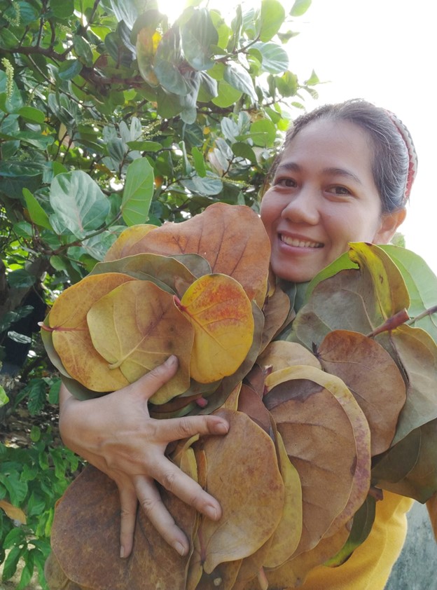 Lá tra còn được gọi là lá nho biển hay bạc biển. Lá tra có độ dày, độ dai tuyệt vời, đó chính là lý do vì sao chị Hà và anh Tuyến chọn lá tra làm nguyên liệu chính cho sản phẩm này. Ngoài ra, lá tra còn có một lớp tinh dầu, thứ giúp cho lá chống thấm nước, giữ được độ bền.