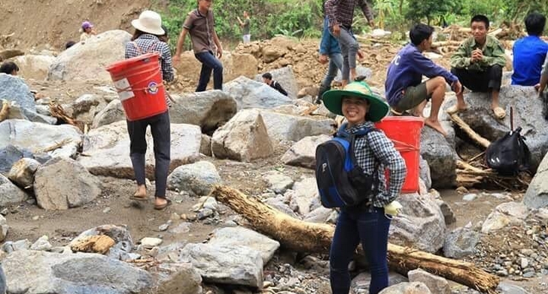 Cô Nguyễn Thị Hoa (áo kẻ) cùng những cộng sự trong chuyến hỗ trợ bà con vùng lũ năm 2017.