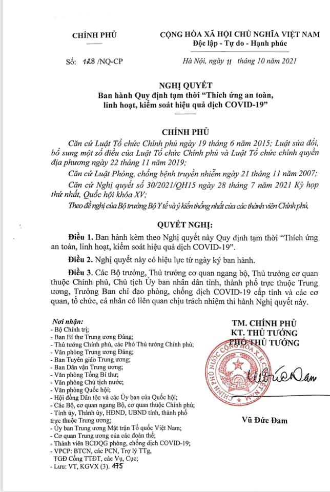 Chính phủ vừa ra Nghị quyết ban hành Quy định tạm thời "thích ứng an toàn, linh hoạt, kiểm soát hiệu quả dịch Covid-19". Theo đó, cả nước ngừng thực hiện Chỉ thị 15, 16, 19, phần lớn các hoạt động trở lại bình thường.