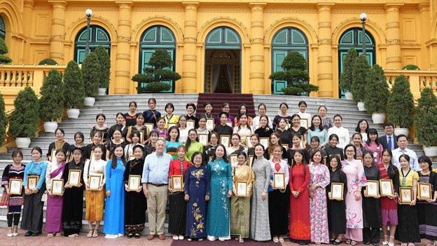 Phó Chủ tịch nước Võ Thị Ánh Xuân cùng các đại biểu và các nữ sinh thuộc dự án "Mở đường đến tương lai" chụp ảnh lưu niệm trước Phủ Chủ tịch