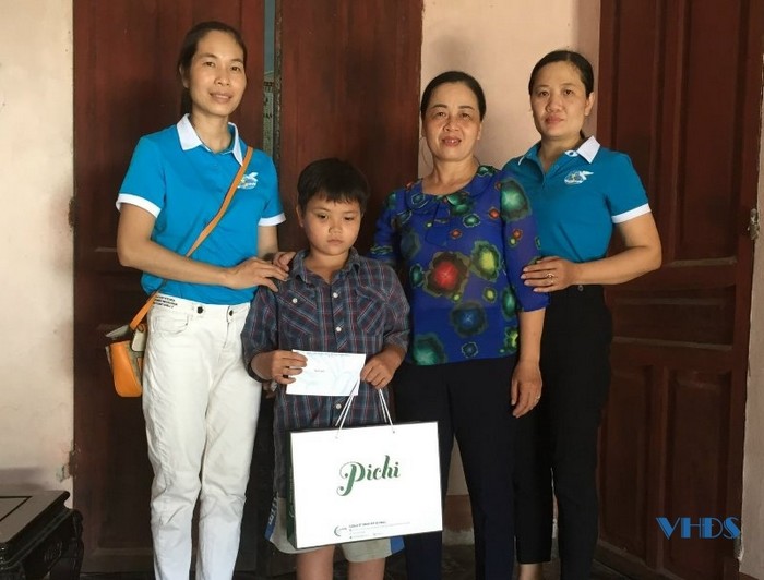 Chị Vũ Thị Thương, Chủ tịch Hội LHPN xã Vĩnh Phúc, huyện Vĩnh Lộc (ngoài cùng bên phải) thăm, tặng quà trẻ có hoàn cảnh khăn