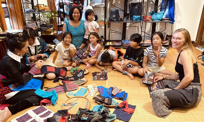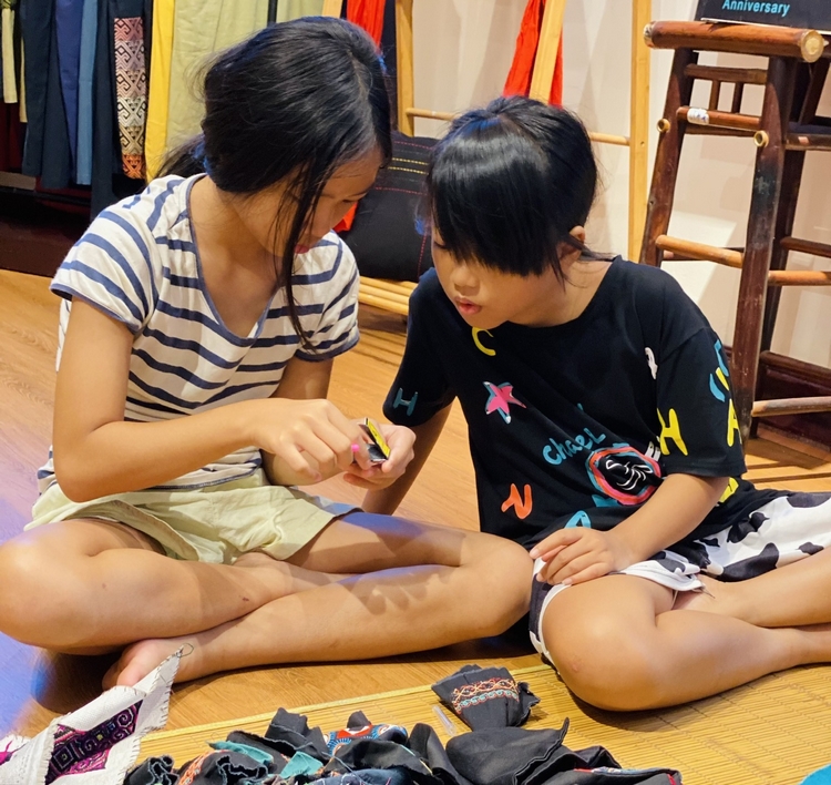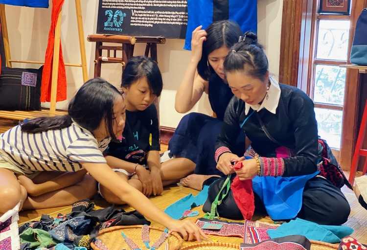 Nghệ nhân Sùng Thị Xé (trái) hướng dẫn kỹ thuật thêu của người H’Mông trắng. Hoạt động được Craft Link tổ chức nhằm giới thiệu cho công chúng, đặc biệt các tín đồ đam mê nghệ thuật sản xuất hàng thủ công truyền thống những kỹ thuật thêu ghép vải truyền thống độc đáo của người Mông trắng. Qua đó, góp phần bảo tồn và phát triển những giá trị văn hóa đặc sắc của vùng đồng bào dân tộc thiểu số.