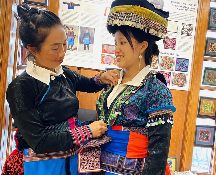 Giới thiệu về kỹ thuật thêu đặc trưng của người Mông trắng, nghệ nhân Sùng Thị Xé chia sẻ: "Trang phục có ý nghĩa rất lớn với người vùng cao. Nhìn vào đó, chúng tôi biết được nguồn cội và bản sắc của dân tộc mình. Vì thế, hầu hết, phụ nữ Mông đều biết thêu ghép vải từ nhỏ, xem nó là truyền thống của gia đình".