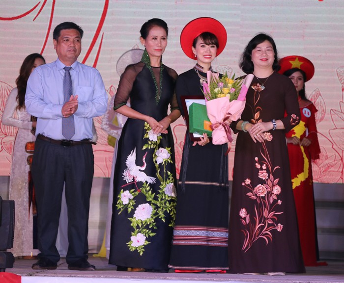 Ban tổ chức trao giải nhất cho thí sinh Bùi Thị Bích Nguyệt-Hội Phụ nữ Công an tỉnh. Ảnh: Ngọc Minh
