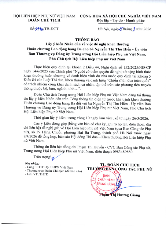 Đoàn Chủ tịch Trung ương Hội Liên hiệp Phụ nữ Việt Nam đăng tải thông tin lấy ý kiến Nhân dân trên Cổng thông tin điện tử trước khi trình khen thưởng Huân chương Lao động hạng Ba đối với bà Nguyễn Thị Thu Hiền - Ủy viên Ban Thường vụ Đảng ủy Trung ương Hội Liên hiệp Phụ nữ Việt Nam, Phó Chủ tịch Hội Liên hiệp Phụ nữ Việt Nam.