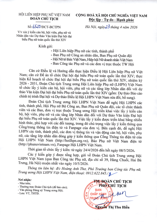 Địa chỉ tiếp nhận văn bản: Hội Liên hiệp Phụ nữ Việt Nam, số 39 Hàng Chuối, phường Hai Bà Trưng, thành phố Hà Nội.