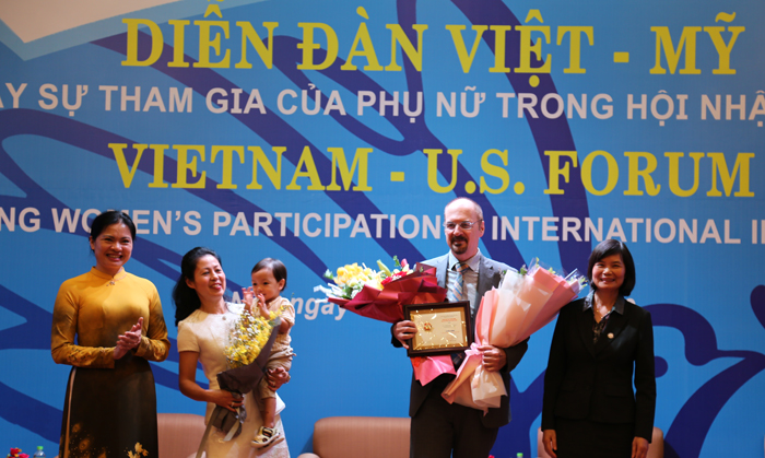 | Tại Diễn đàn, Hội LHPN Việt Nam đã trao Kỷ niệm chương Vì sự phát triển của phụ nữ Việt Nam cho ông Michael DiGregorio, Trưởng Đại diện Quỹ Châu Á tại Việt Nam để ghi nhận, tri ân những đóng góp tích cực của Ông đối với các hoạt động hỗ trợ Hội LHPN Việt Nam, phụ nữ Việt Nam cũng như sự nghiệp bình đẳng giới ở Việt Nam Chủ tịch Hà Thị Nga trao Kỷ niệm chương Vì sự phát triển của phụ nữ Việt Nam cho ông Michael DiGregorio Chủ tịch Hà Thị Nga, Giám đốc Bảo tàng PNVN Nguyễn Hải Vân (phải ảnh) tặng hoa chúc mừng ông Michael DiGregorio cùng vợ và con. |