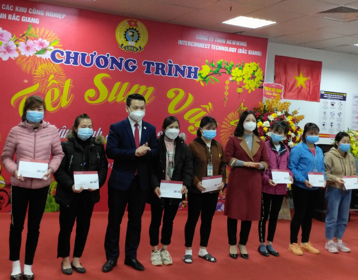 Hưởng ứng Chương trình “Triệu phần quà san sẻ yêu thương” do Trung ương Hội LHPN Việt Nam phát động; hưởng ứng phong trào “Cả nước chung tay vì người nghèo,Không để ai bị bỏ lại phía sau”, sáng ngày 21/01/2022 Hội LHPN tỉnh Bắc Giang phối hợp với Liên đoàn Lao động tỉnh tổ chức thăm và tặng quà cho nữ công nhân đang làm việc tại Công ty TNHH New Wing Interconect Technology Bắc Giang.