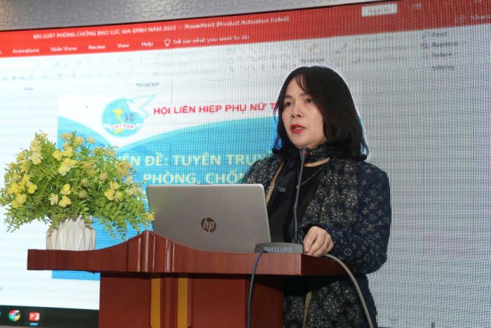 Chủ tịch Hội LHPN tỉnh Cầm Thị Hồng Duyên giảng viên tại hội nghị