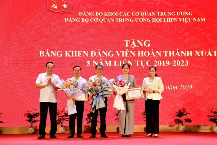Theo Quyết định số 1551-QĐ/ĐUK ngày 4/5/2024, ba đảng viên thuộc Đảng bộ cơ quan TW Hội LHPN Việt Nam đạt tiêu chuẩn đảng viên “Hoàn thành xuất sắc nhiệm vụ” 5 năm liền, 2019-2023 gồm: đảng viên Hà Thị Nga, Bí thư Đảng đoàn, Chủ tịch Hội LHPN Việt Nam, chi bộ Tổ chức; đảng viên Phùng Đình Kiện, Phó Tổng Giám đốc, chi bộ Tổ chức Tài chính vi mô TNHH MTV Tình thương (TYM); đảng viên Nguyễn Bình Hạnh, Trưởng phòng Kiểm soát nội bộ, chi bộ Tổ chức Tài chính vi mô TNHH MTV Tình thương (TYM).